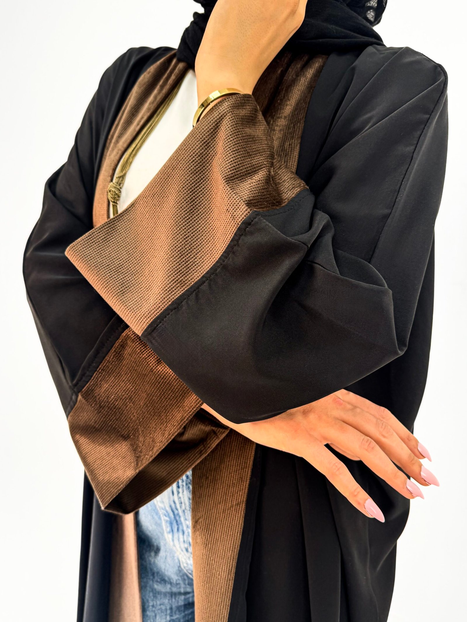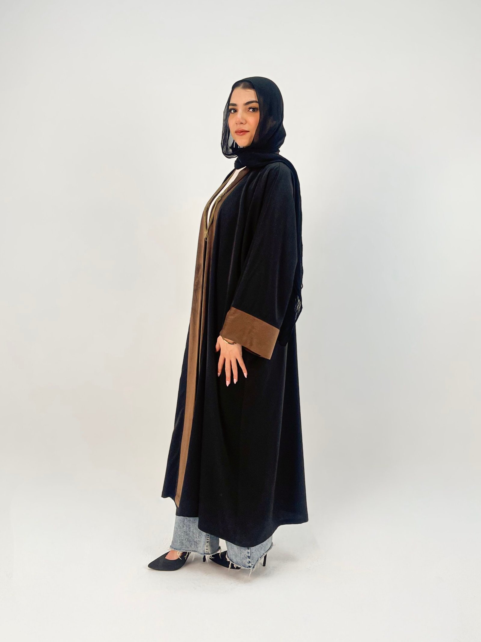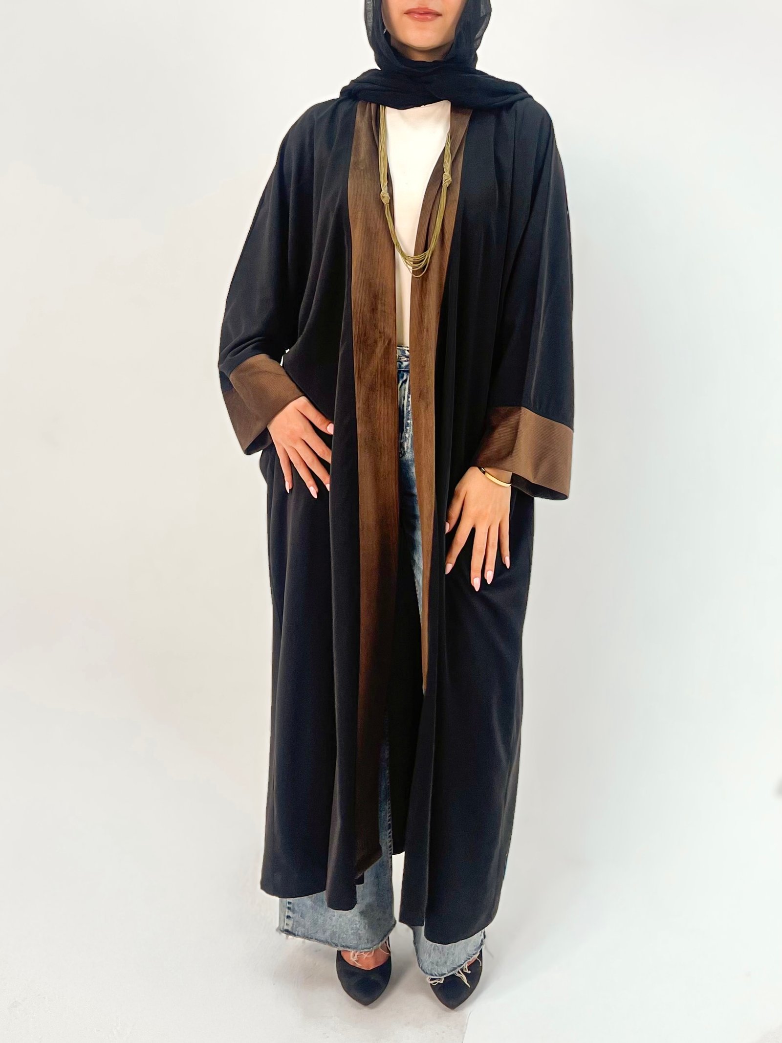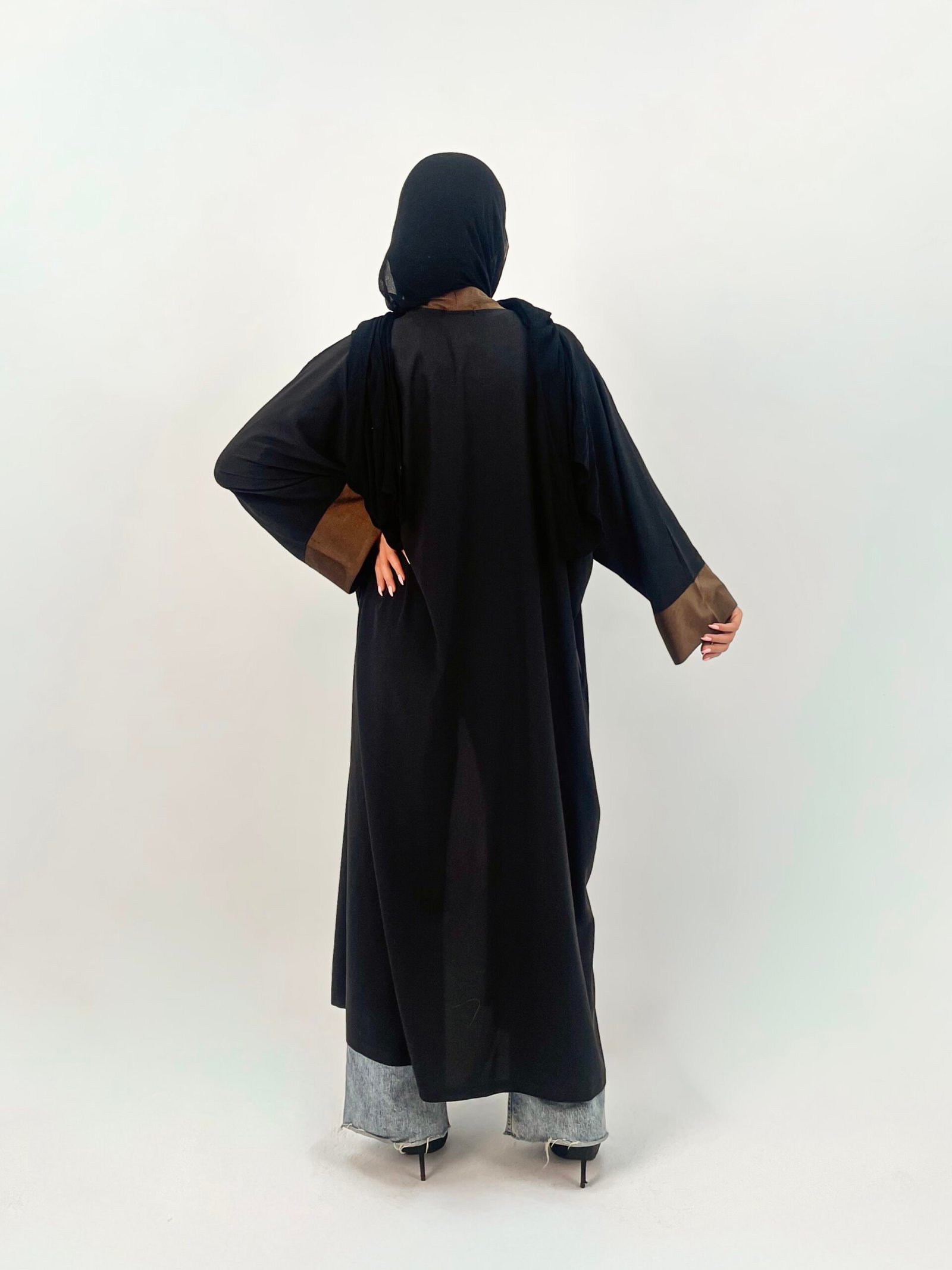 Inspired by the gentle movement of desert sands, رِمَال is a black abaya with brown trim that exudes understated elegance and quiet sophistication.