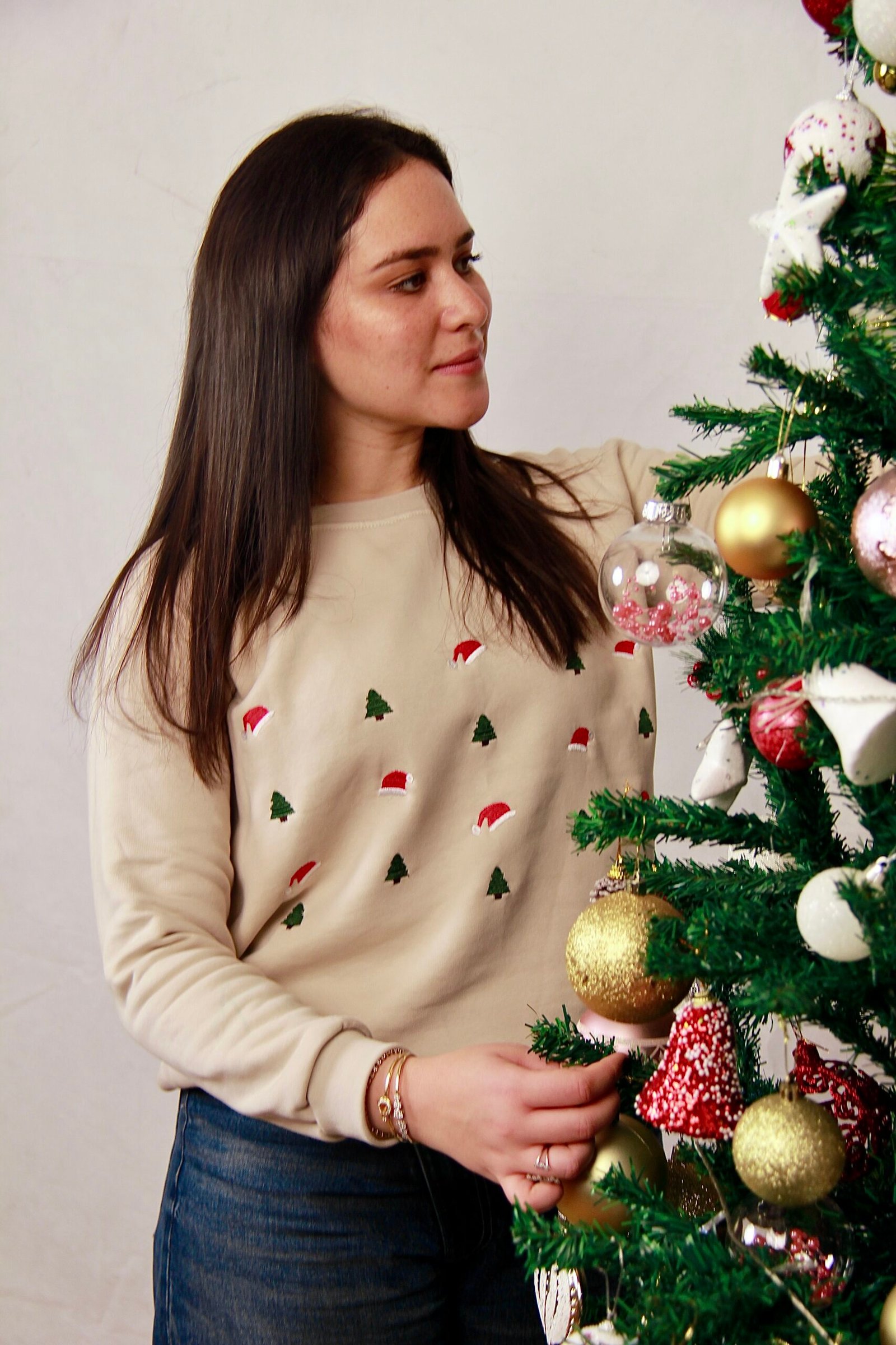 Get ready to embrace the joy of the festive season with our beautiful beige Christmas sweatshirt, thoughtfully designed to combine charm and comfort. Perfect for holiday gatherings, family outings, or cozy evenings, this sweatshirt features eye-catching embroidery of red Santa hats and mini Christmas trees. A classic design for those who love timeless holiday aesthetics, it’s sure to spread cheer wherever you go.