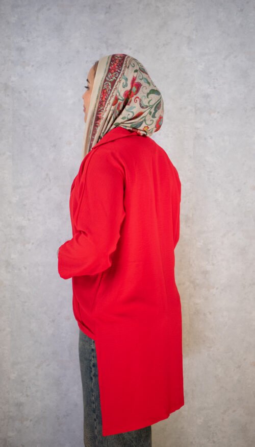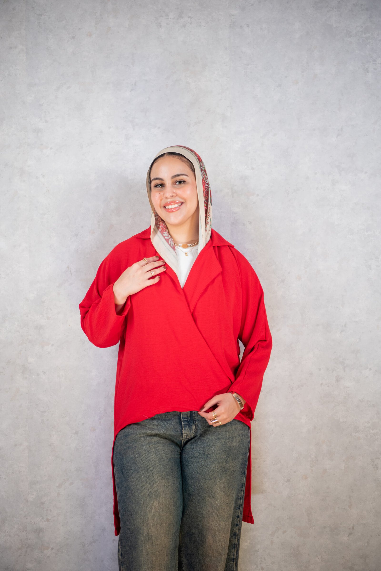 Introducing the Criss Cross Blouse, a stunning addition to your wardrobe that marries modesty with contemporary style. Available in a vibrant red, this blouse is not just a piece of clothing; it’s a statement. Whether you’re heading to a casual outing or a more formal gathering, you’ll find that this versatile top meets your fashion needs seamlessly.