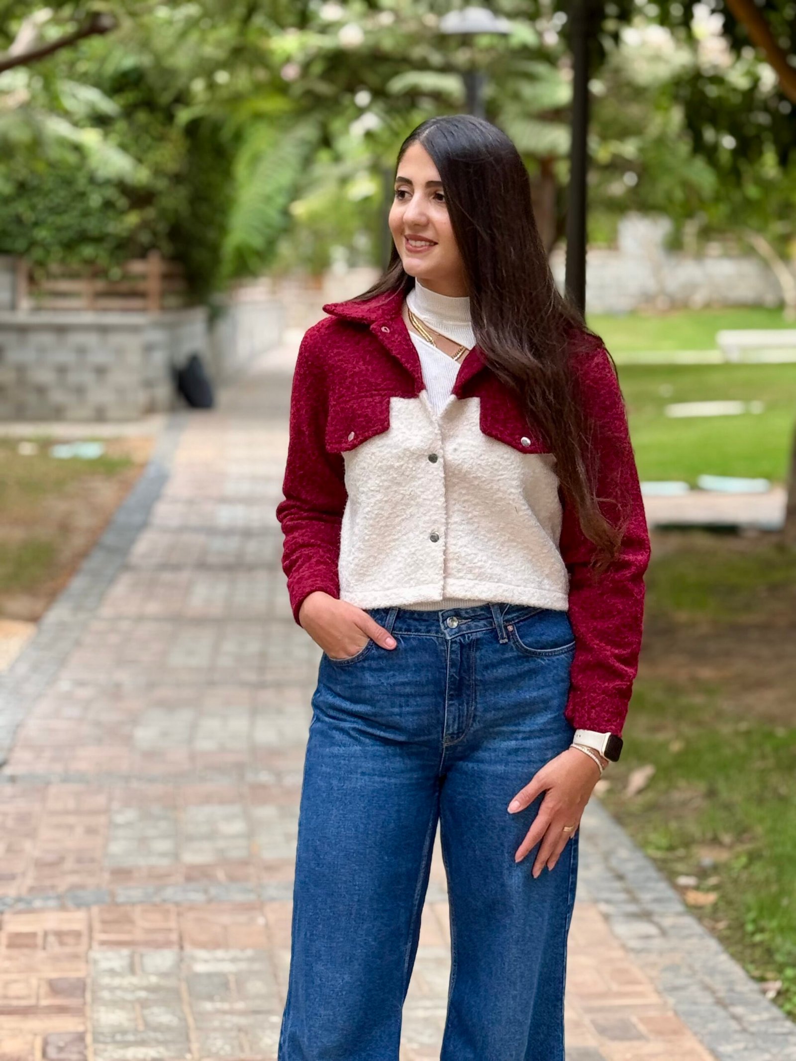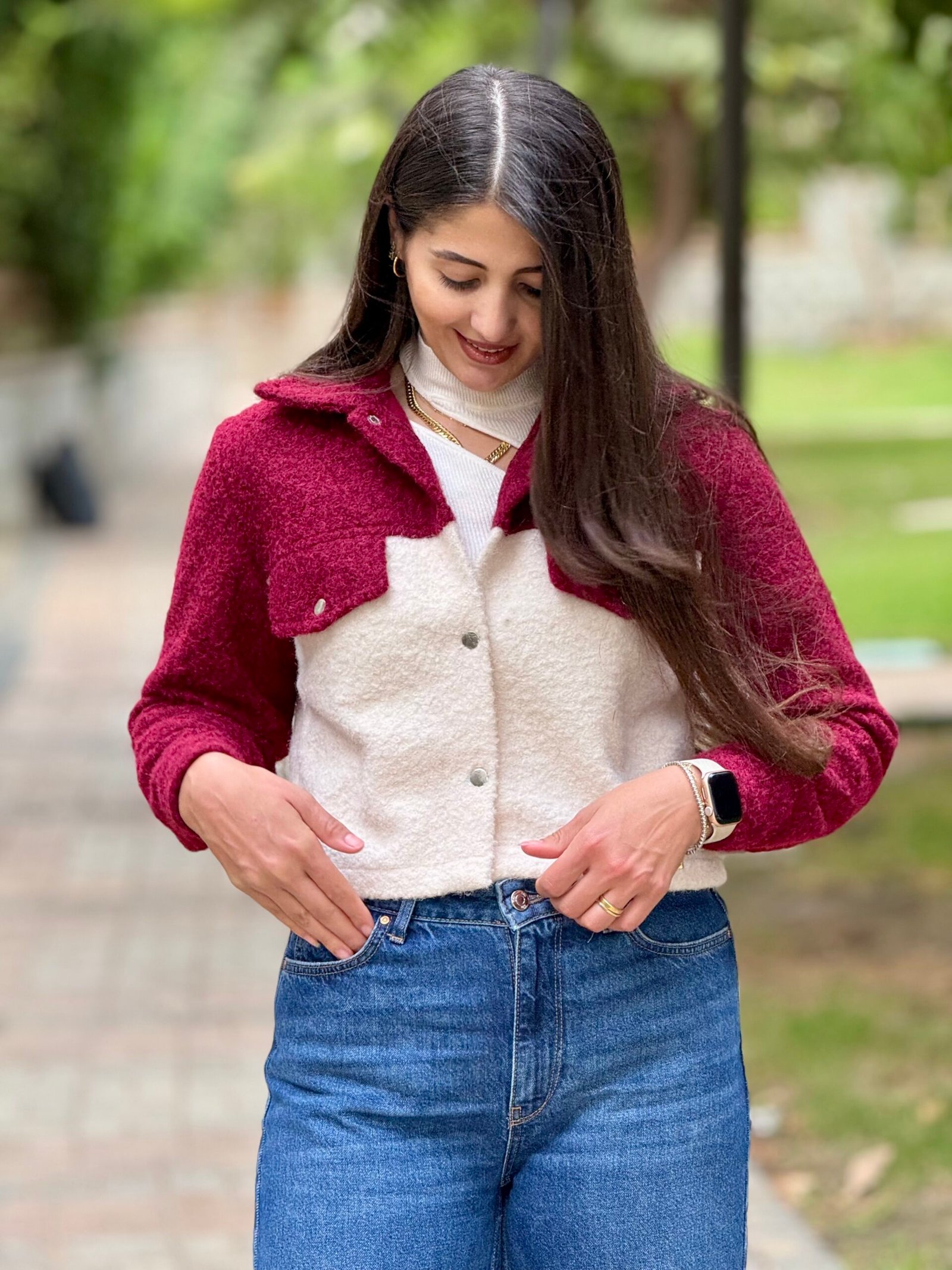 Carefully crafted from high-quality wool, our jackets stand out with their soft texture and excellent durability. The cropped design adds a touch of modernity, ensuring you stay stylish while keeping warm. The off white base gives a clean, classic appearance, while the burgundy and rose accents add a pop of color to draw just the right amount of attention to your ensemble.