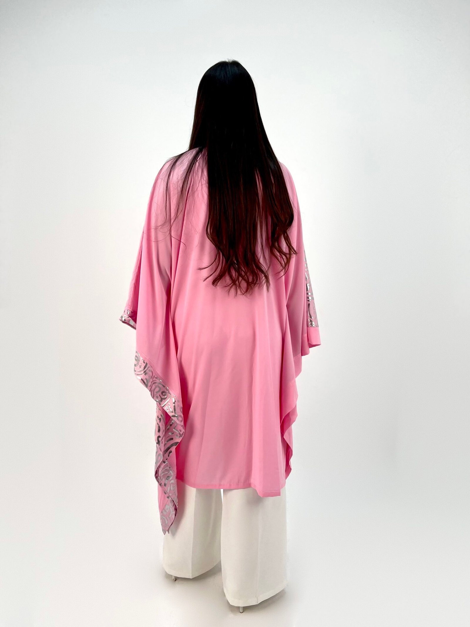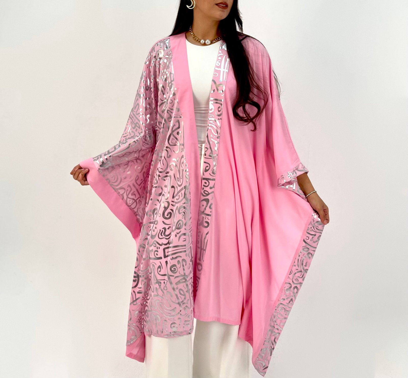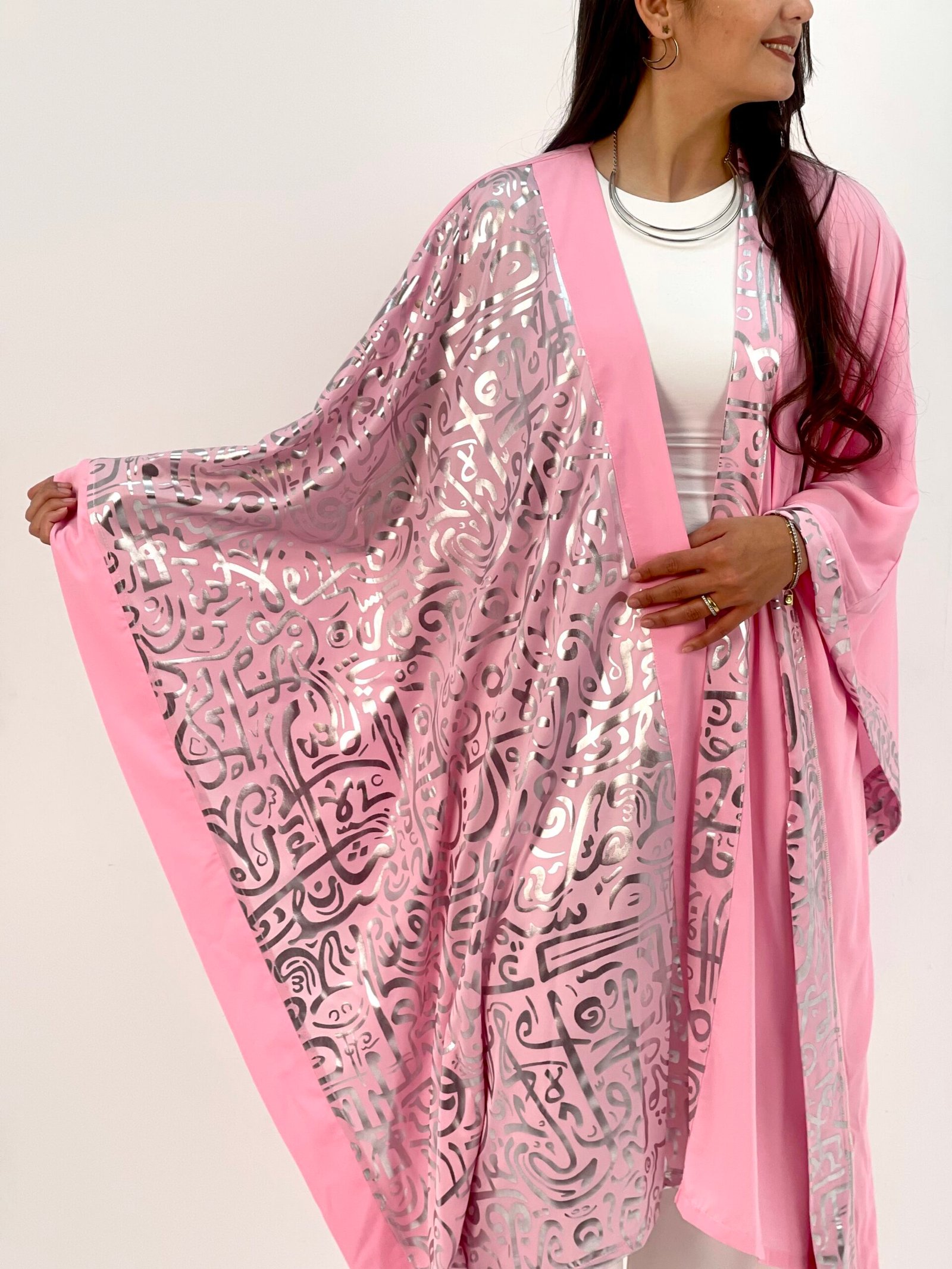 Elegant silver calligraphy flows across soft pink fabric, telling a story of artistry and grace.