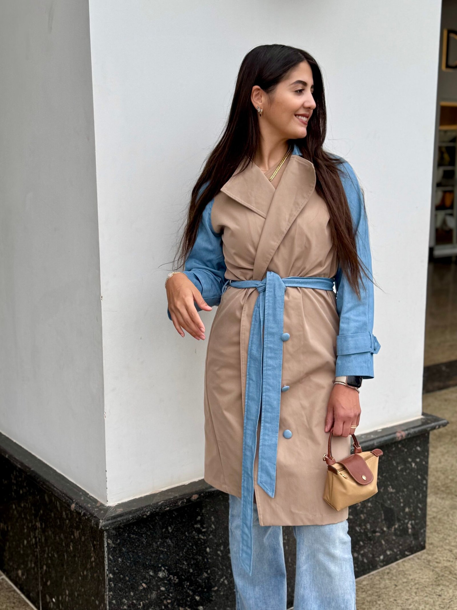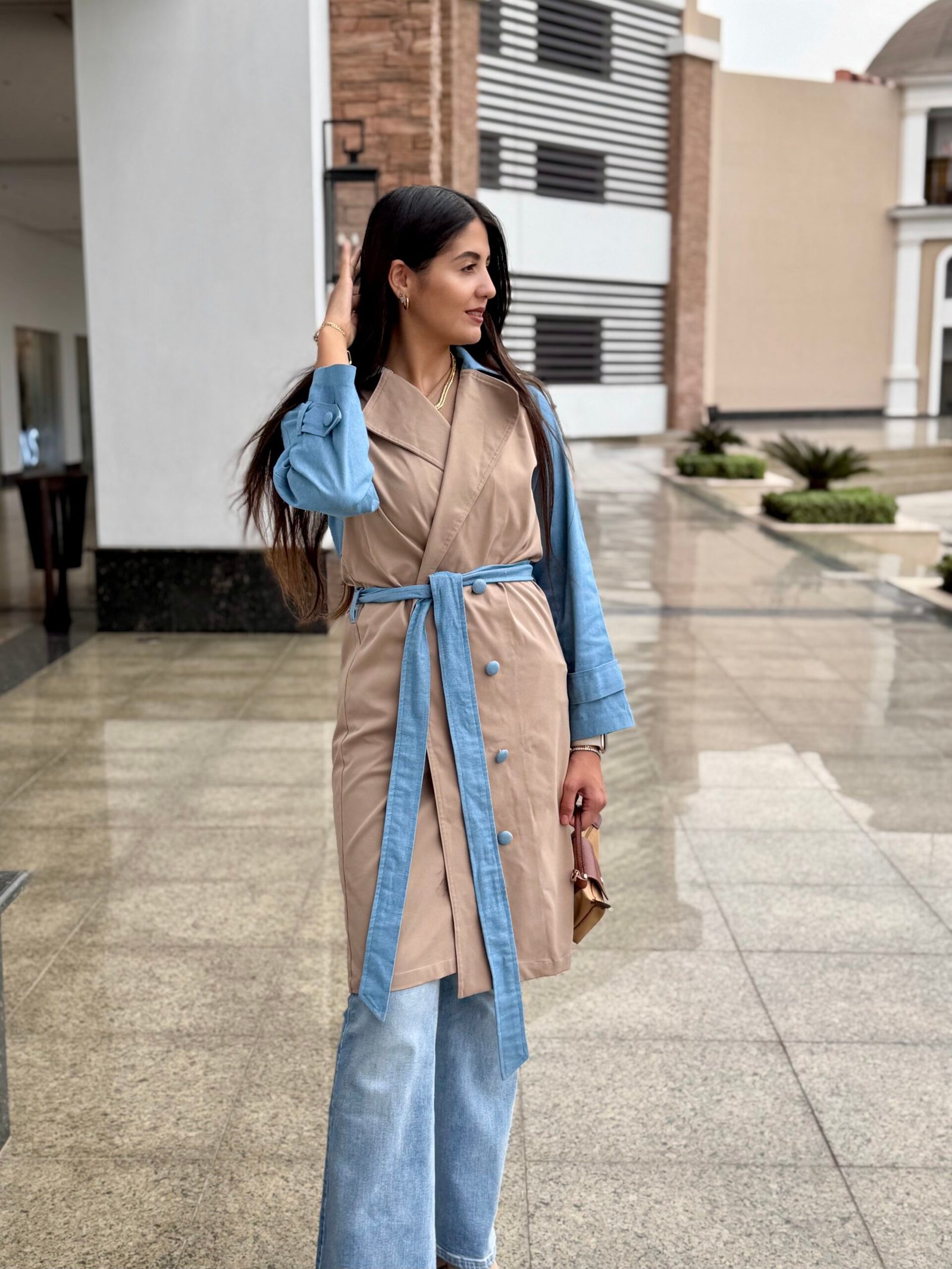 Combining the classic appeal of beige with the casual edge of jeans material, this trench coat is versatile, stylish, and perfect for any occasion. Whether you’re dressing up for a chic evening look or layering for casual outings, this coat effortlessly complements your wardrobe. The tailored fit enhances your silhouette, and the adjustable belt allows you to customize the look for added style and functionality.