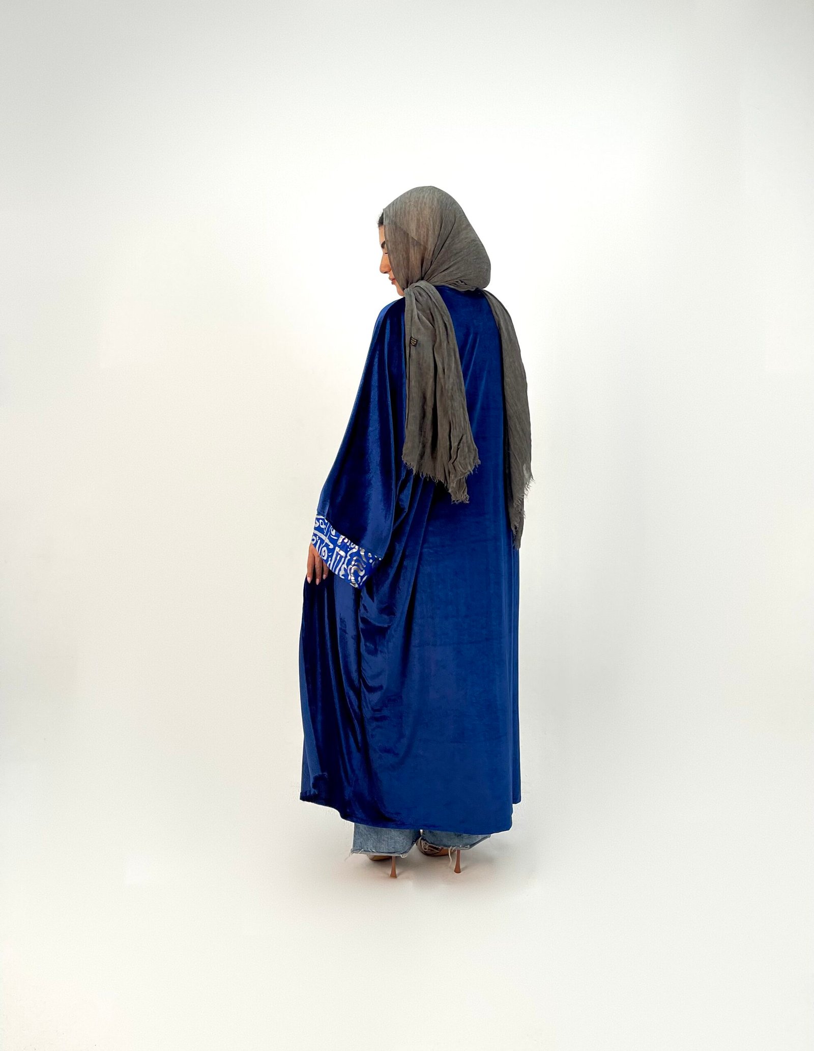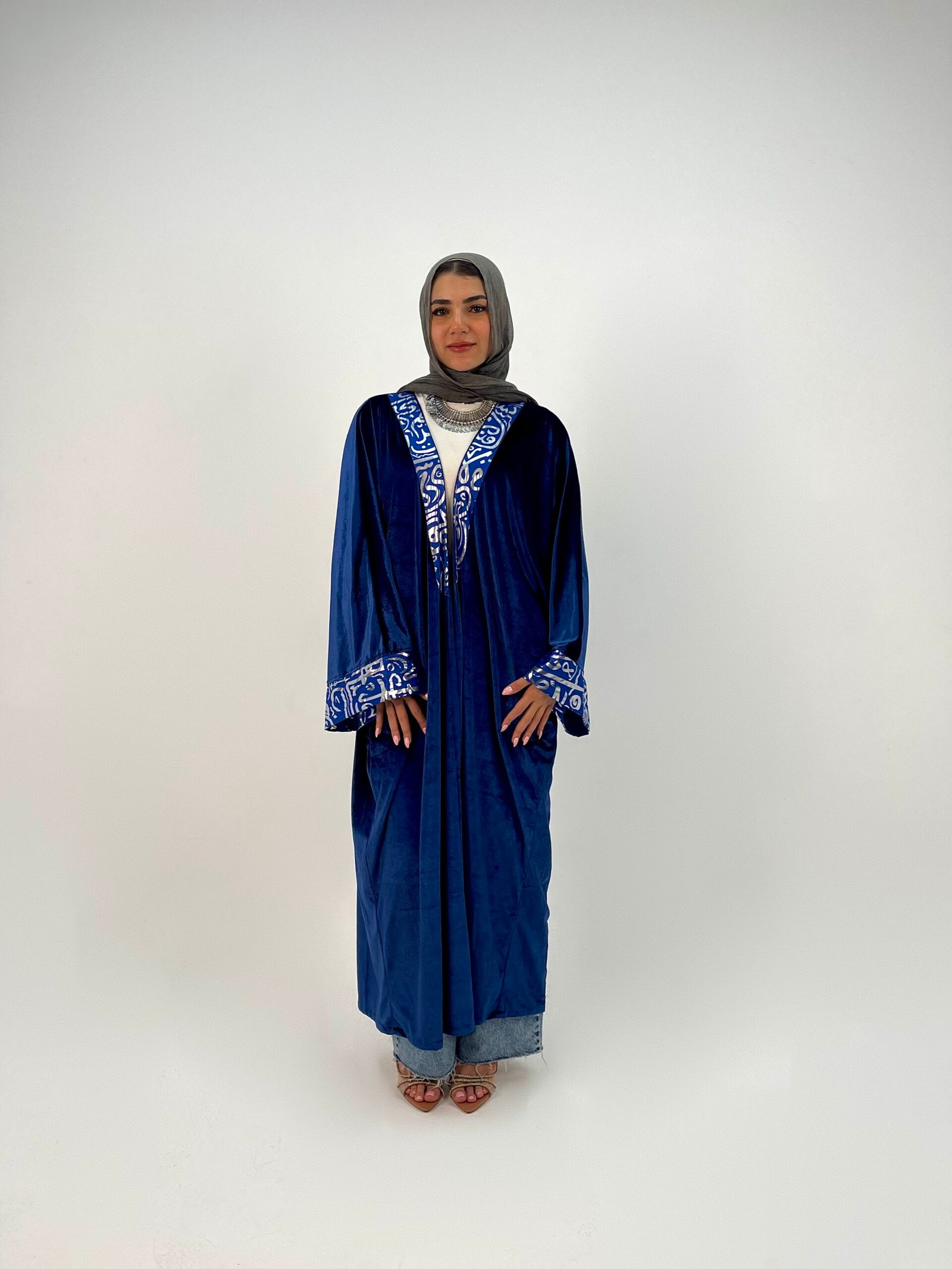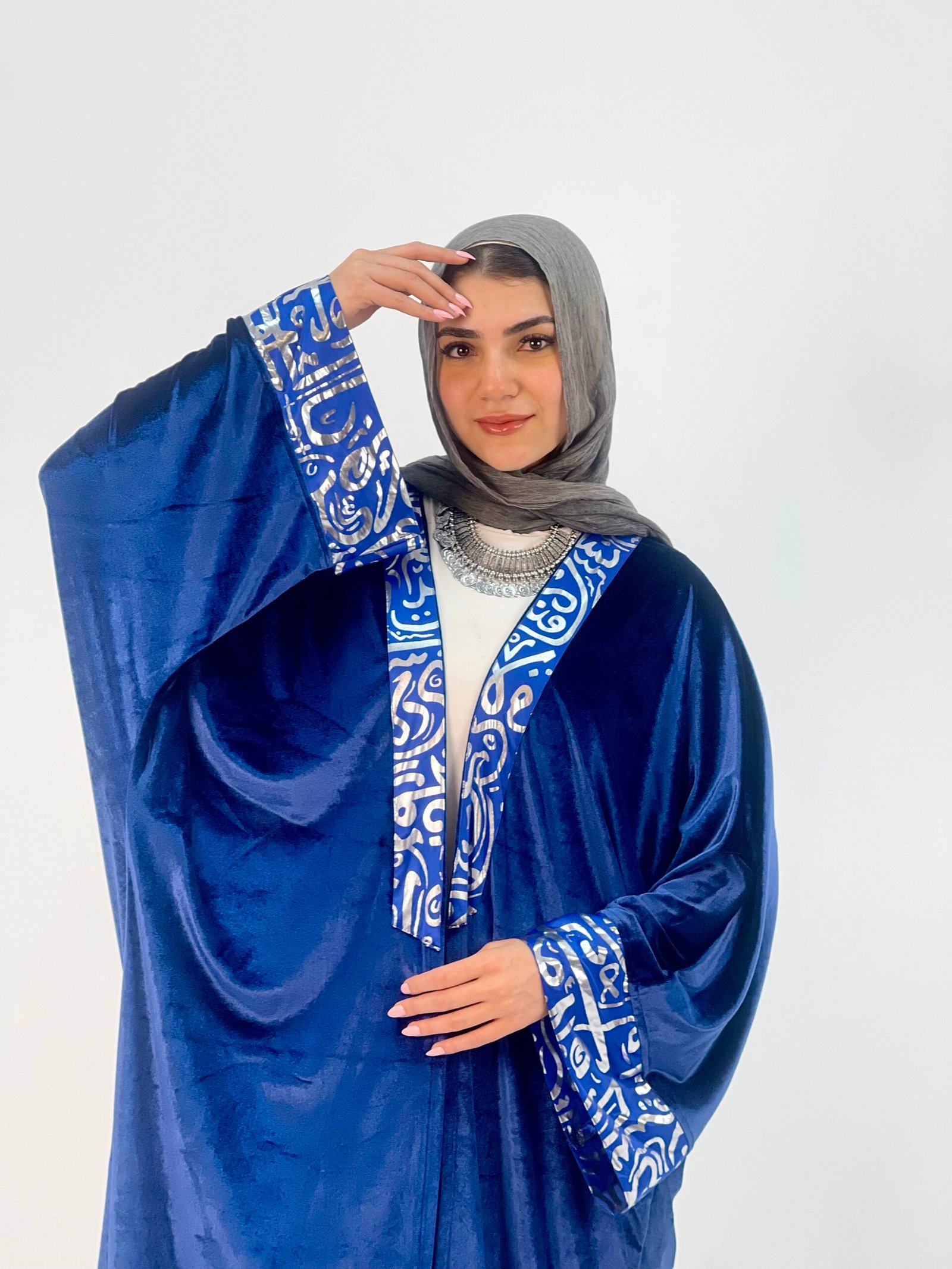 Intricate Arabic calligraphy sweep across this Kaftan like a tranquil night sky, creating a captivating and serene elegance.