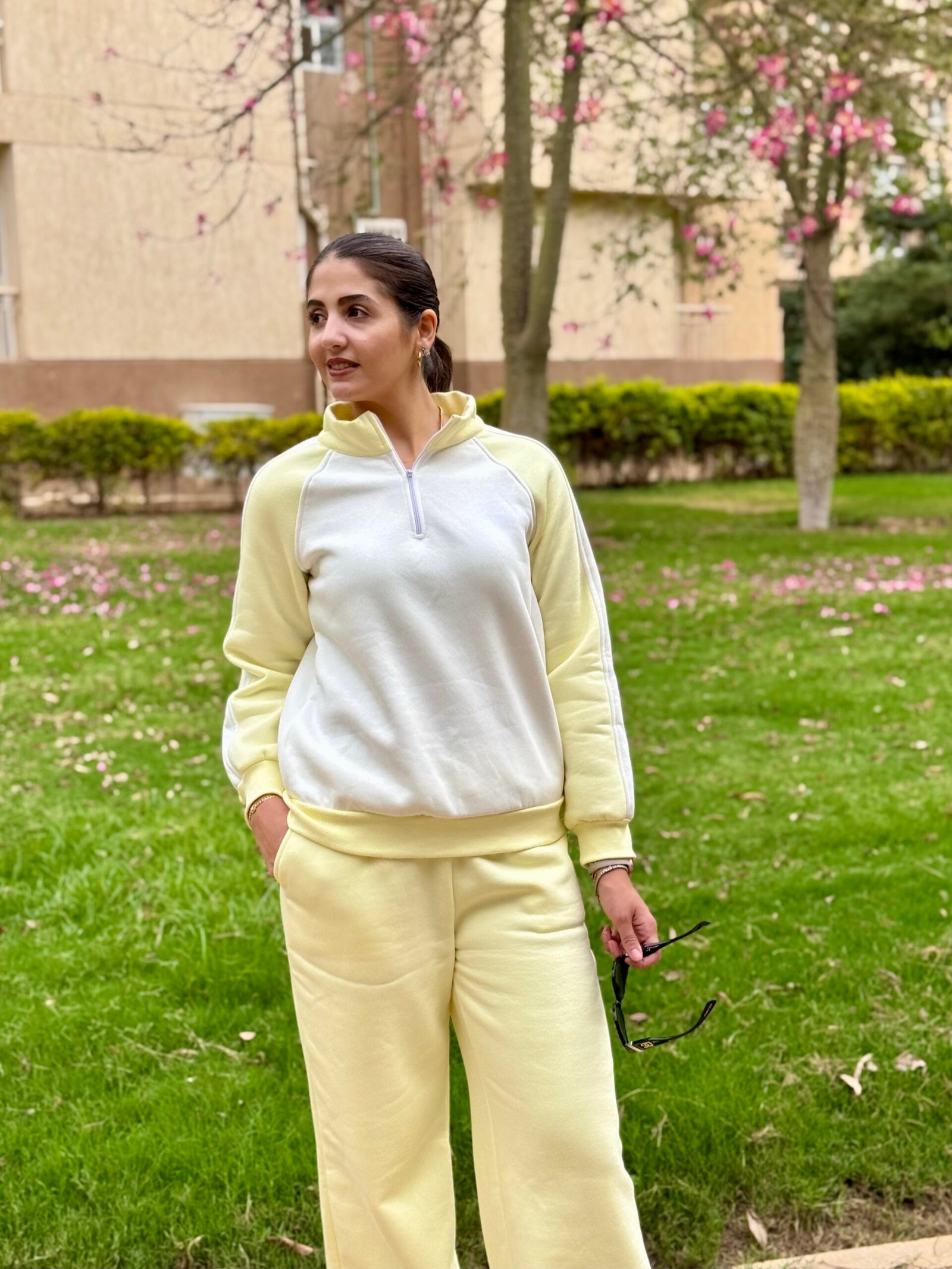 The Melton Training Suit in a mix of butter yellow and off white is your ultimate companion for workouts or casual outings. Designed with precision to provide comfort and style, this outfit seamlessly blends practicality with elegance. The buttery yellow tones are refreshing and vibrant, complemented beautifully by the off-white accents to portray a sleek and sophisticated look. Whether you’re hitting the gym, engaging in physical activities, or navigating busy days, this training suit keeps you confident and comfortable.