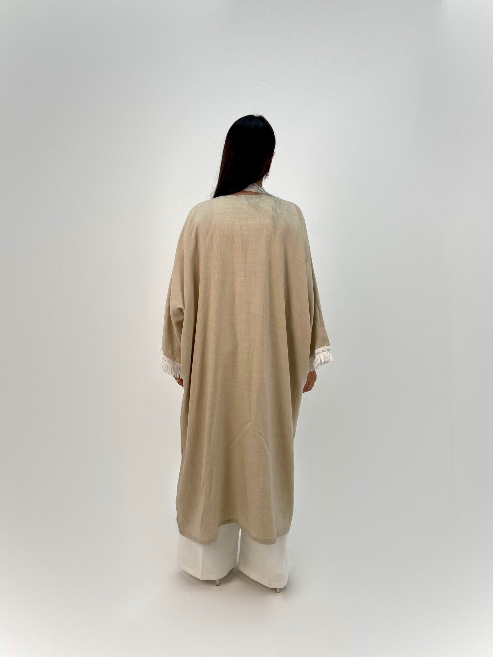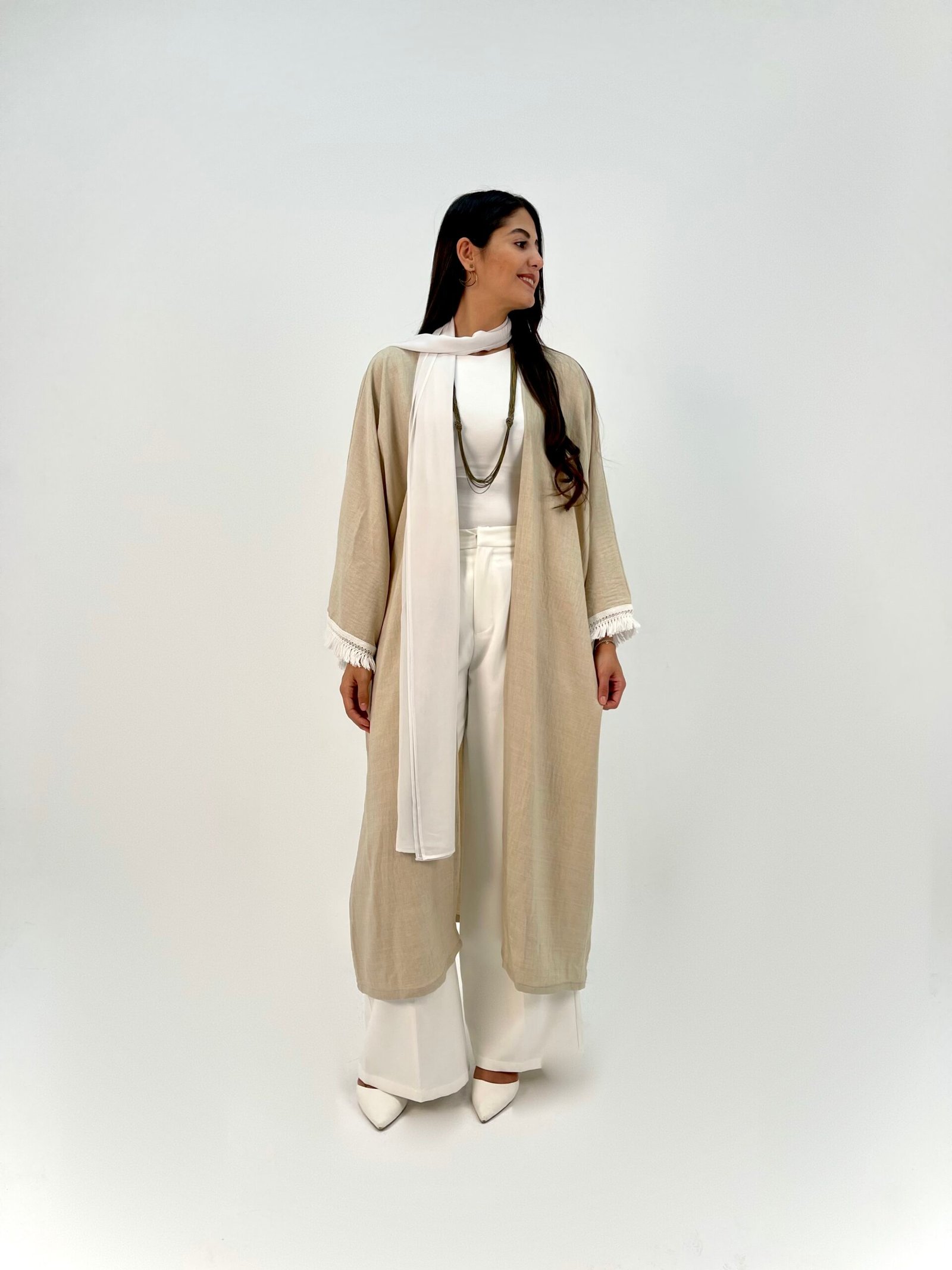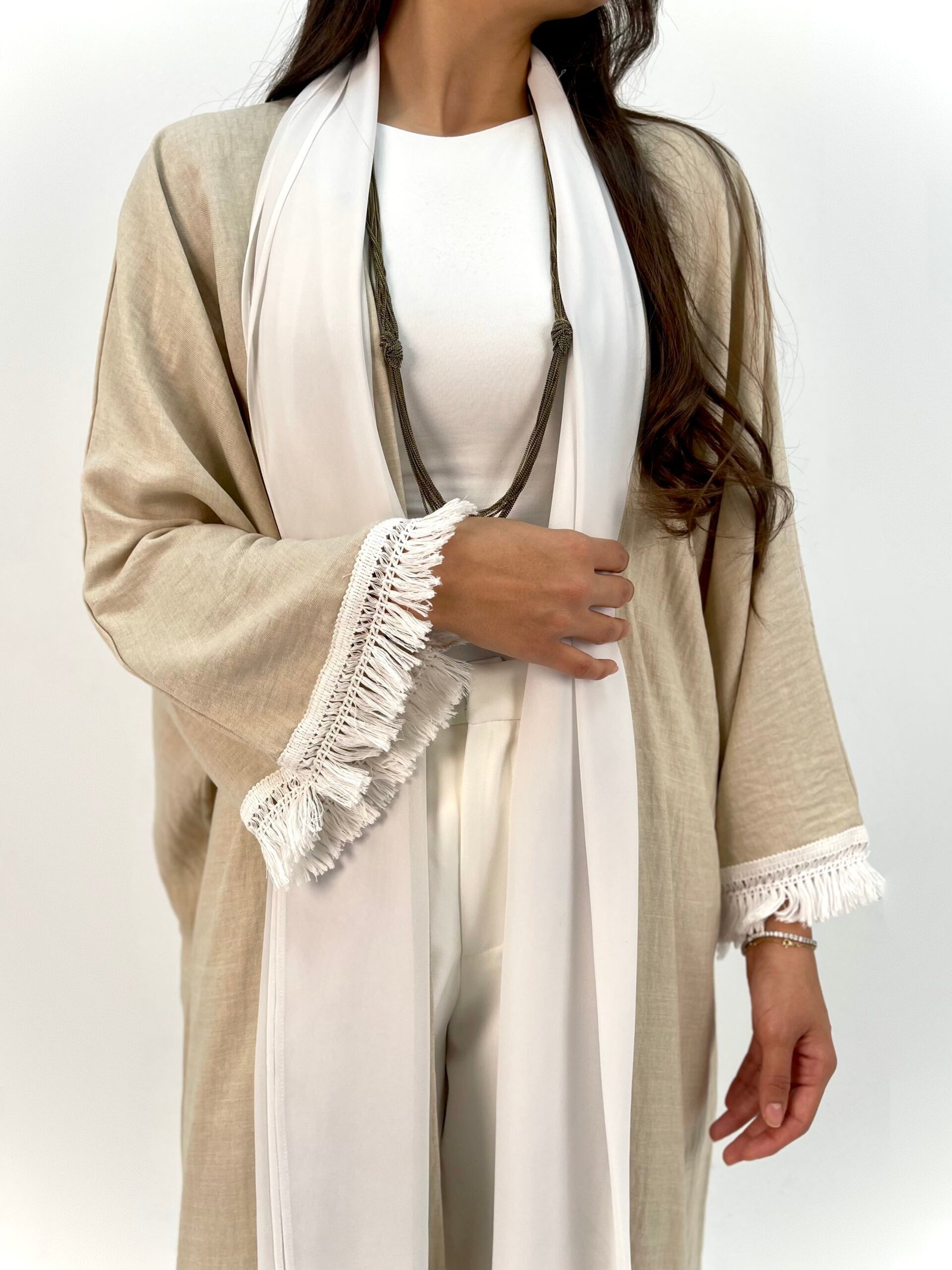 White fringe details add a delicate touch to a relaxed, elegant silhouette.